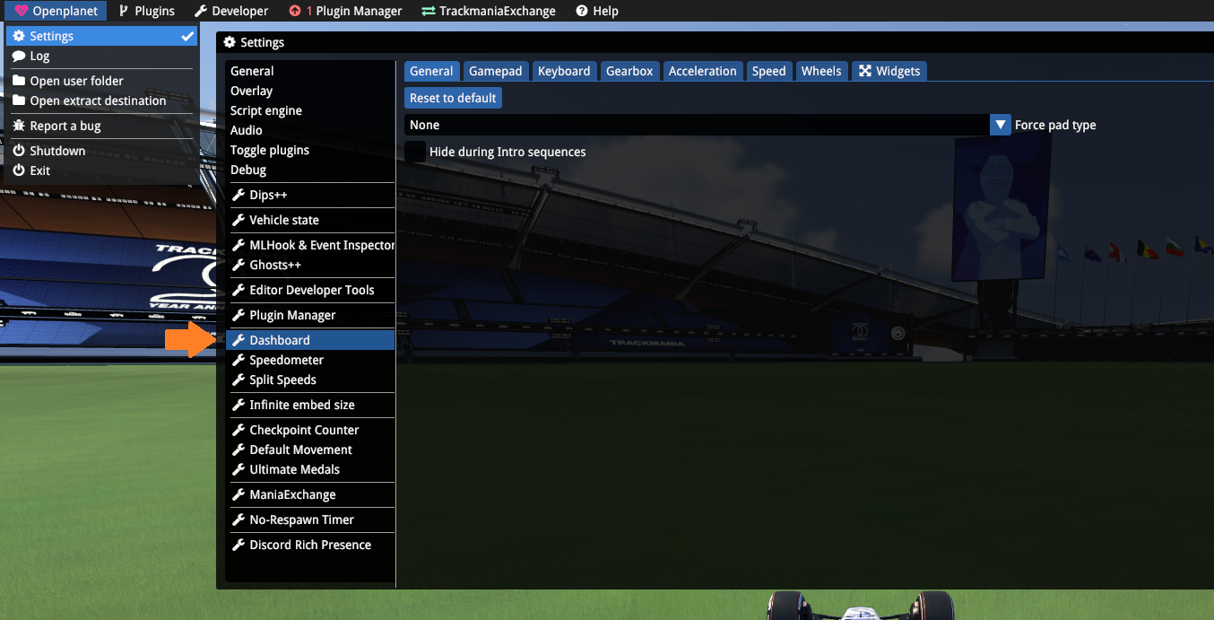 設定は、「OpenPlanet」→「Settings」→「Dashboard」で行えます。