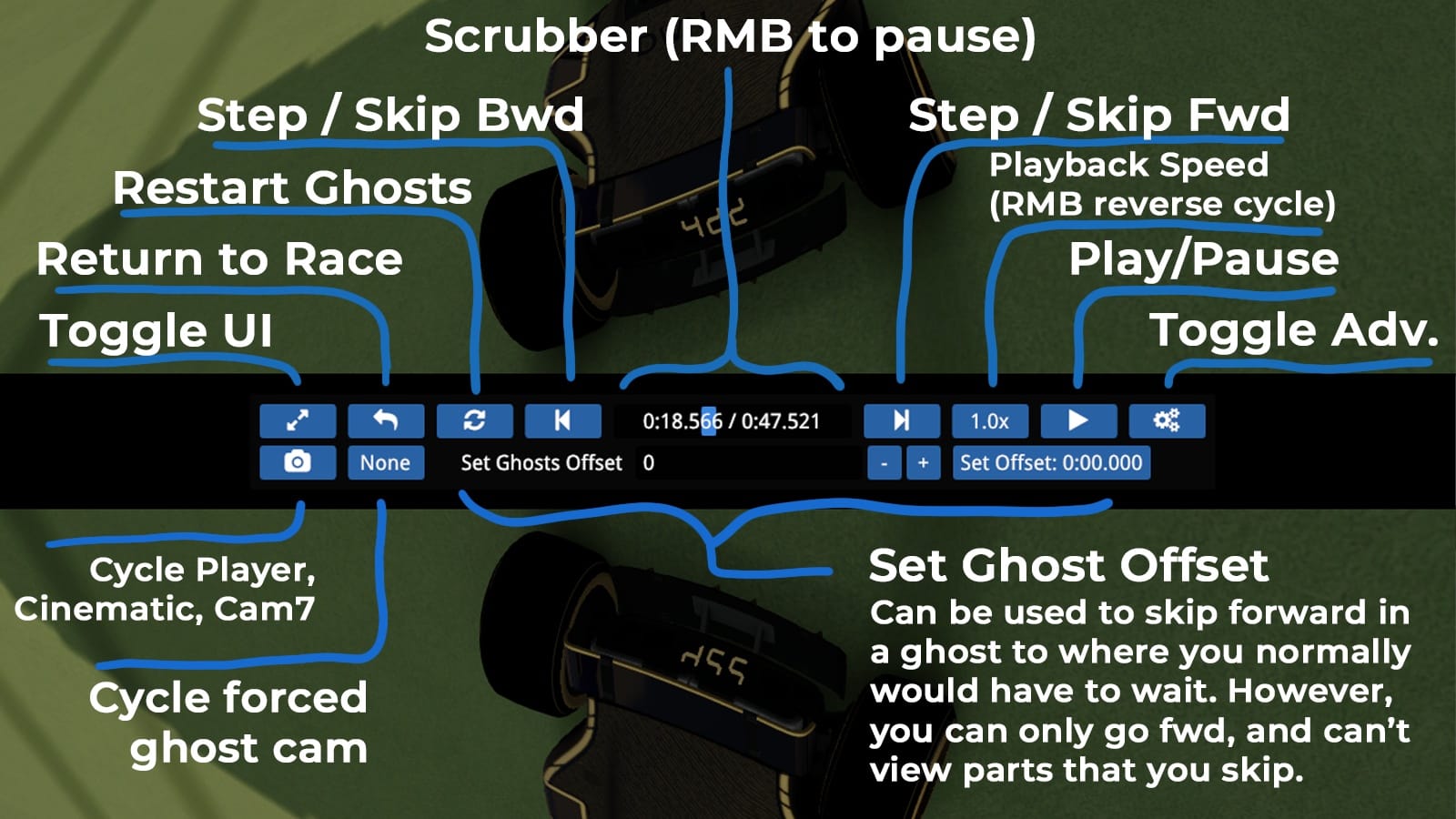 左下のCycle forced ghost camでは、どのカメラ設定でリプレイを見るか選択可能です。