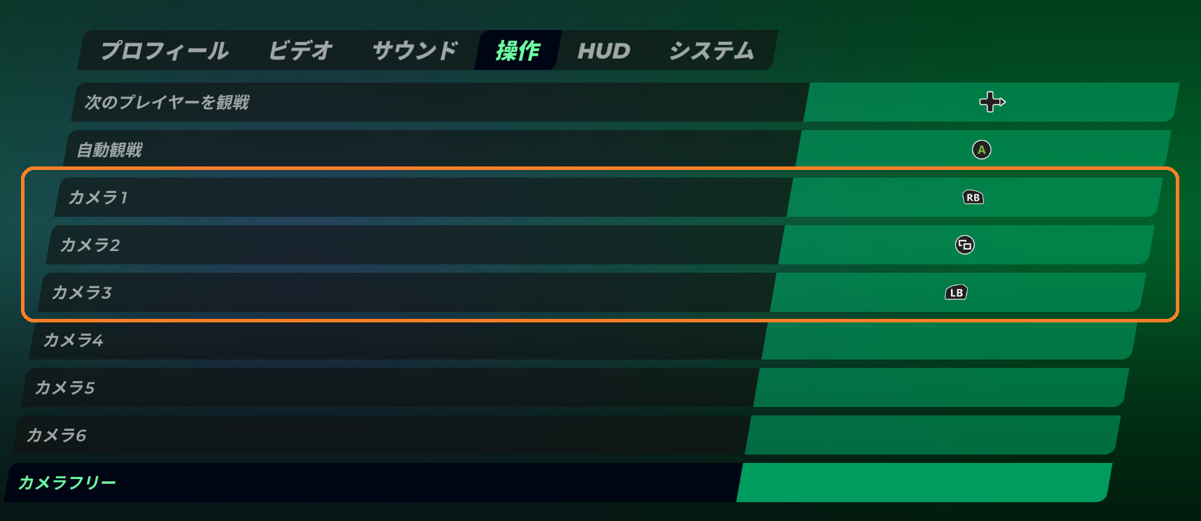 設定を開き「操作」タブを開くと、下の方に「カメラ1」~「カメラ3」の設定があります。ここにボタンを割り当てることで、切り替え可能になります。