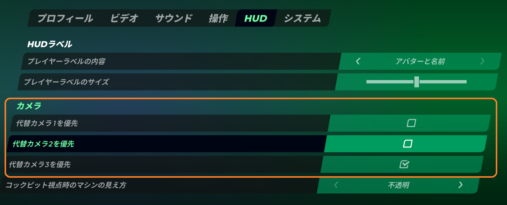 また、代替バージョンの方をデフォルトにしたい場合は、設定から「HUD」タブを開き、「代替カメラを優先」にチェックを入れましょう。